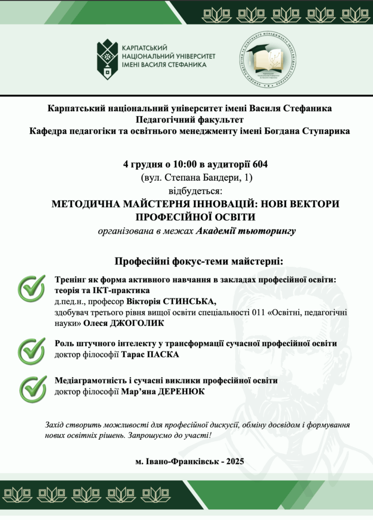 Запрошуємо всіх охочих долучитися до заходу «Методична майстерня інновацій: нові вектори професійної освіти», який відбудеться 4 грудня о 10:00 в аудиторії 604 (вул. Степана Бандери, 1). Захід організовується в межах Академії тьюторингу Карпатського національного університету імені Василя Стефаника, Педагогічного факультету Читати далі